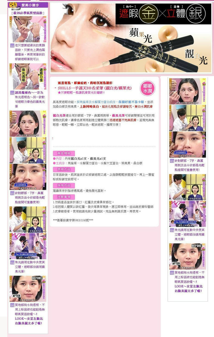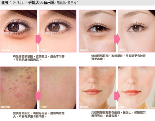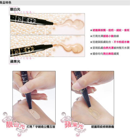 Description : Shills BB Luminous Concealing Pen ( 2 pcs per box)遮蓋斑點、修飾痘疤,將暗沉斑點隱形,輕輕一點讓肌膚質光彩耀眼! SHILLS一手遮天BB名采筆-具高度遮瑕功能,採水解大豆蛋白、角鯊烯及水解彈力蛋白成份,保濕好推不易卡粉,並添加桑白根及熊果素,上妝同時保養,能淡化斑點及修護暗沉,嫩白水潤肌膚,靚白光筆適合用於眼部、T字、鼻翼兩側等,蘋果光筆可修飾雙頰並可用於局部黯沈肌膚,讓膚色更明亮創造立體臉龐!迅速遮蓋不完美肌膚,呈現完美無瑕感,輕輕一轉,立即出色,輕抹遮瑕,攜帶方便!