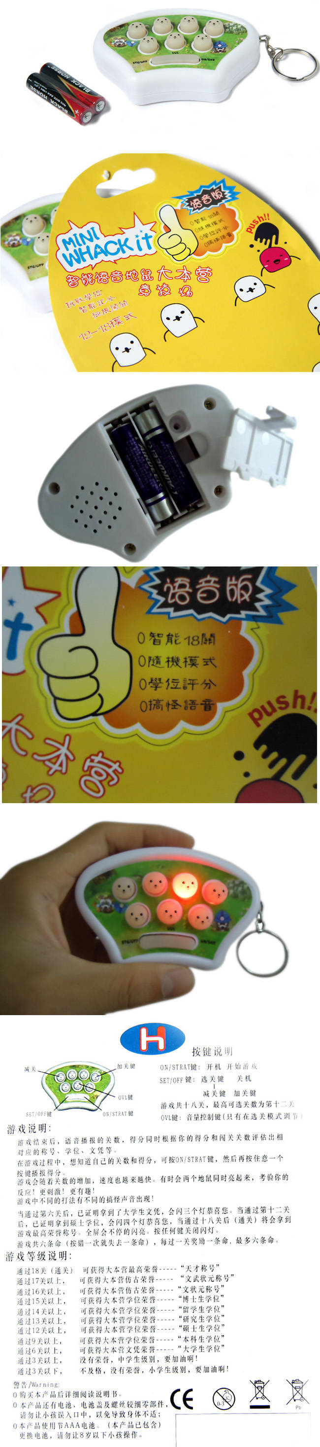 ![]() 游戏共十八关,通过选关按键最高可选关数为第十二关 VOL键: 音量键(只有在选关模式调节) 游戏结束后,语音播报当前关数 ,得分。同时根据你的得分和闯关关数评估出相对应的称号、学位、文凭等。 在游戏过程中 ,想知道自己的关数和得分,可按ON/STRAT键,然后再按任意一个按键播报得分。 游戏会随着关数的增加,速度也越来越快。有时会两个地鼠同时亮起来,考验你的反应!更刺激!更有趣! 游戏中不同的打法有不同的搞怪声音出现! 当通过第六关后,已证明拿到了大学生文凭,会闪三个灯恭喜您。当通过第十二关后,已证明拿到硕士学位,会闪四个灯恭喜您,当通过十八关后(通关),将拿到游戏最高荣誉称号。全屏灯会不停闪亮。按任何键关闭闪灯。 游戏共六条命(按错一次就失去一条命),每过一关奖励一条命,最多六条命. 游戏等级说明: 通过18关(通关) 可获得大本营最高荣誉-----“天才称号” 通过17关以上, 可获得大本营仿古荣誉-----“文武状元称号” 通过16关以上, 可获得大本营仿古荣誉-----“文状元称号” 通过15关以上, 可获得大本营学位荣誉-----“博士生学位” 通过14关以上, 可获得大本营学位荣誉-----“留学生学位” 通过13关以上, 可获得大本营学位荣誉-----“研究生学位” 通过12关以上, 可获得大本营学位荣誉-----“硕士生学位” 通过9关以上, 可获得大本营学位荣誉-----“本科生学位” 通过6关以上, 可获得大本营文凭荣誉-----“大学生文凭” 通过3关以上, 没有荣誉,中学生级别,要加油啊! 通过3关以下, 不及格,没有荣誉,小地鼠级别,要加油啊!