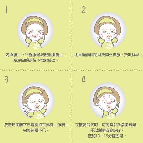 ◆使用方式:於清潔肌膚後,將面膜輕敷於全臉,把面膜左