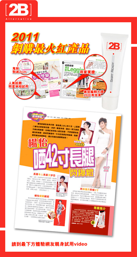 最新2B Skirt Ready,了解现今女性之需要,推出最全面、最专业的美腿配方,一支即能有效瘦腿、控毛、白滑、去水肿、通淋巴,令妳由hip位靓到落脚踭。瘦腿