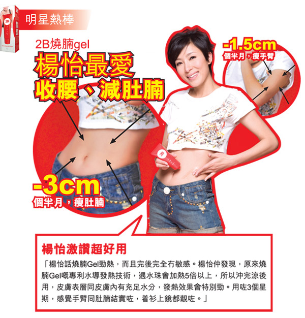 2B使用09年激新研發"深層燃脂精華",免除舊式產品只以辣椒、薑等箤取物促進發熱,未能真正達致溶脂效果,"深層燃脂精華"會隨水份滲入肌膚才產生熱力,使脂肪消耗,達到深層燃脂效果,並可減少因辣椒素所產生的敏感和容易灼傷皮膚等問題。