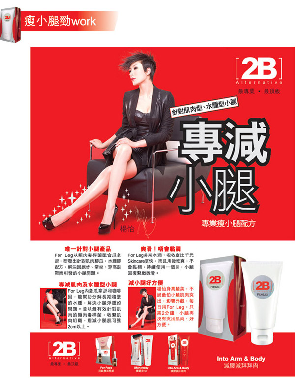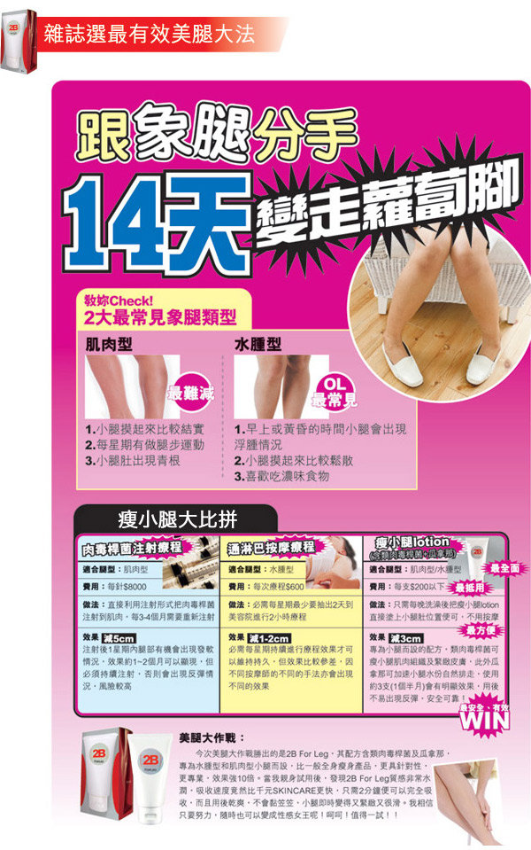 2BOTOX的主要成份類元素,由於功效顯着,以往皆被歐美品牌争相采用,但兩年前售價往往要過千元一支,未必人人買得起。而自上年日本将技術普及後,類 價格亦相應下降,而最新推出的2BOTOX Alternative for leg 速瘦易小腿霜,主要是針對小腿肌肉而設計的産品,對不同的腿型困擾,如水腫型及肌肉型小腿,有明顯曲線回複的效果,其中所含的瓜拿那與,對於促進新陳代 謝、脂肪代謝也有相當的幫助,至令小腿或甚至是大腿的曲線同樣有很好的效果。使用方法