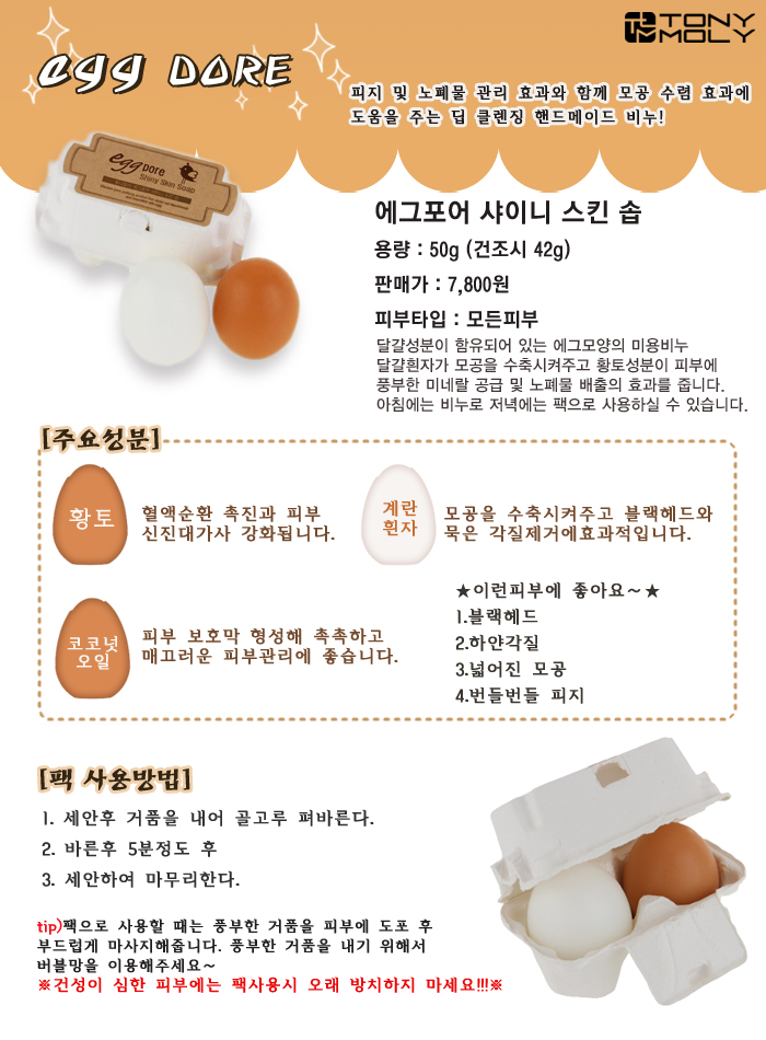 所以要有效的去除黑头粉刺,清洁毛孔就要尝试使用这款T ony Moly的鸡蛋洁面皂了!有效的收缩毛孔,增加弹力,使 脸部皮肤保持水嫩可以去除老废角质,提供皮肤营养让肌肤 看起来细腻透明,如鸡蛋般细嫩放在手上真的好不舍得使用,不过为了战胜黑头和毛孔唯有跟它拼了! 产品说明: 能有效的管理皮质和老化物质,收缩毛孔,提供皮肤营养, 保持水水嫩嫩,让肌肤看起来透明,如鸡蛋般细嫩。 是一款让毛孔变得更加细腻有光泽,透明保湿的洁面皂。 适合人群:任何皮肤 使用方式: 白色鸡蛋早上用,缓解毛孔问题,有助缩小毛孔 黄色鸡蛋晚上用 ,含有黄土成分,有效吸附毛孔内垃圾,洁净肌肤 使用沾湿的手拿鸡蛋揉出适量泡沫,轻轻在脸上按摩,再以清水洗净即可。 宝贝介绍: - 洗去多余油脂和老化物质,有助收缩毛孔的深层洁净皂 - 泡沫丰富,同时为肌肤提供营养和滋润感,让肌肤明亮通透 Egg Pore Shiny Skin Soap Rich Foam from the Soap Controls Sebum and Removes Dirt in Pores, Leaving the Skin Silky Smooth with the Necessary Nutrients and Moisture. White egg: Whitening effect Brown egg: Tightening effect ![]() ![]()