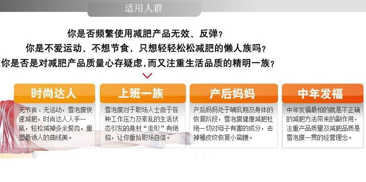 Description : 使用说明:(使用周期)早晚各一次,用于清洁皮肤之后,睡前做最佳。 使用方法: 充分摇匀:在充分摇匀到听不到水声后,瓶身直立挤压出适量的雪泡。 用力按压:取适量(按压直径约3cm的泡沫与手心),以画圈的方式由内而外按摩部位2~3分钟。 均匀涂抹:将按摩过的部位配合轻微或中度运动。 减肥产品您可千万小心,别图便宜买到假货,不但浪费钱,还伤害身体。