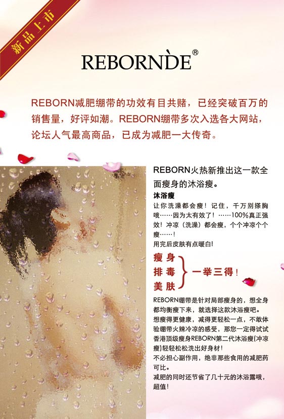 想瘦得更健康,减得更轻松一点,不敢体验绷带火辣冷凉的感受,那您一定得试试香港顶级瘦身REBORN第二代沐浴瘦(冲凉瘦)轻轻松松洗出好身材!