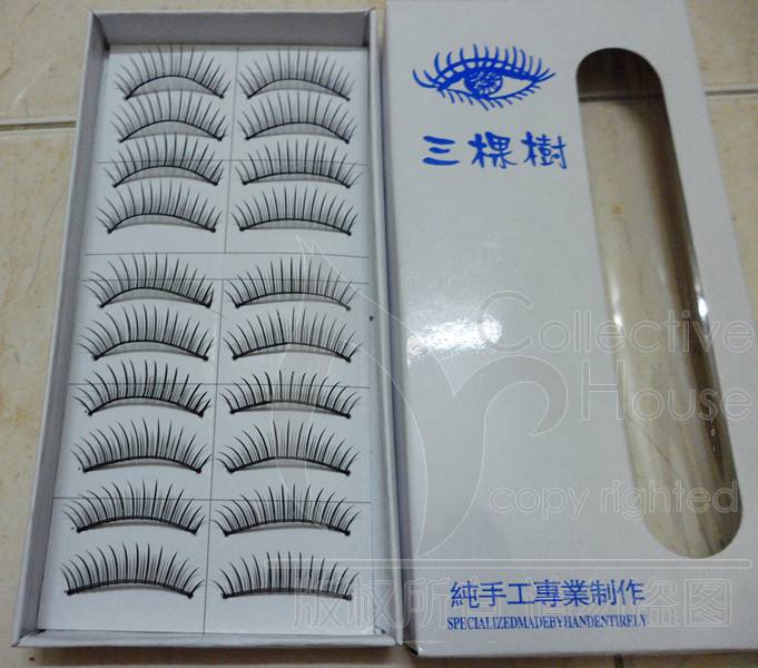 Description : 1box - 10对 三颗树假睫毛~影楼~化妆师专用~~ ,足可以假乱真。配合不同色系的眼影及妆容,不管什么场 合都不会有任何夸张的感觉,甚至没有人知道你用了假睫毛 ,真是“此时有妆似无妆”。是出席PARTY、演出艺员 、生活妆、个性妆必备的好搭档