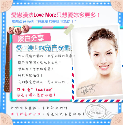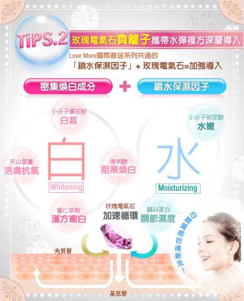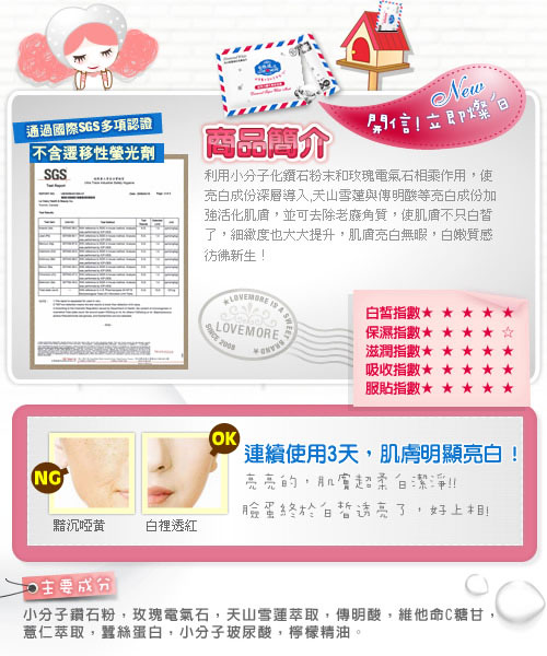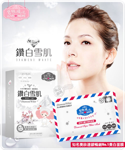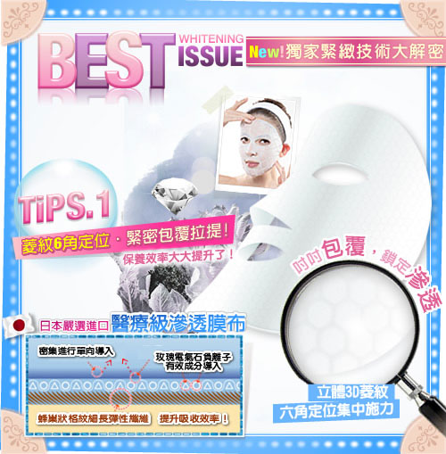 天山雪蓮與傳明酸等美白成份加強活化肌膚, 使肌膚不只白皙 了,細緻度也大大提升,肌膚亮白無暇,白嫩質感彷彿新生! ![]() ◆主呵護成分簡介◇小分子鑽石粉末~幫助有效成分導入,提升肌膚高透亮度。 ◇玫瑰電氣石~幫助精華深層吸收,提升活化循環力。 ◇天山雪蓮萃取~主要成份總?酮,保護肌膚光亮色澤。 ◇薏仁萃取~亮白肌膚,緊緻拉提。 ◇傳明酸m-Tranexamic Acid~高穩定性,高效亮白肌膚。 ◇維他命C醣?~均勻雪亮膚色! ◇小分子玻尿酸~親膚性玻尿酸,可形成表層保水凝膜,補水鎖水效力最強! ◇蠶絲蛋白~加強修護,回賦彈力,補充滿滿營養! ◇檸檬精油~穩定皮脂分泌油量,使肌膚達到高油水平衡,並再次深層清潔肌膚。 ◆商品成分:小分子鑽石粉,玫瑰電氣石,天山雪蓮萃取,傳明酸, 維他命C糖甘,薏仁萃取,蠶絲蛋白,小分子玻尿酸,檸檬精油. 使用方法:臉部基礎保養後,均勻服貼全臉,輕壓使面膜與肌膚密合,約15~20分鐘取下,剩餘精華可按摩全臉輕拍吸收,不須沖洗;冬季建議可將錫箔袋浸泡於溫水中,約30秒再以同步驟使用,效果亦佳。 注意事項: 1、本產品因個人體質或過敏症狀,請停止使用,並洽詢皮膚科醫師。 2、勿將本產品塗抹於傷口、紅腫及皮膚異常部位。 3、面膜請勿重複使用。 4、本產品含豐富植物性萃取,若造成自然氧化變黃,些微沈澱,皆屬自然現象,請安心使用。 5、請置於幼兒無法取得處。