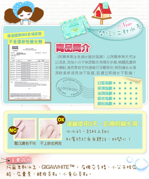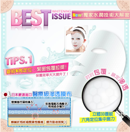 使用方法:臉部基礎保養後,均勻服貼全臉,輕壓使面膜與肌膚密合,約15~20分鐘取下,剩餘精華可按摩全臉輕拍吸收,不須沖洗;冬季建議可將錫箔袋浸泡於溫水中,約30秒再以同步驟使用,效果亦佳。