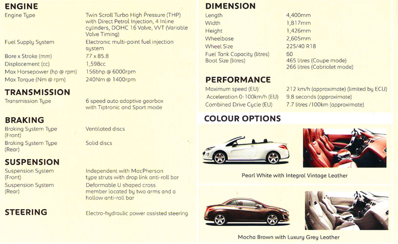 Simply by pressing the control on the center console in only 20 seconds, the retractable rigid roof folds away silently transforming your cabriolet converts into a coupe, offering tranquility and silence in the passenger compartment. In coupe configuration, the 308 CC has 465 litres of boot space, while in cabriolet configuration, it has 266 litres of boot space. On-The-Road Price with insurance: RM 186,888.00