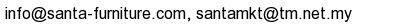 Company ParticularCompany : | Santa Marketing Sdn Bhd | Fax : | 607-3886991 | Address : | No.10 Jalan Permas 9/6, Bandar Baru Permas Jaya, 81750 Masai Johor. Malaysia | Email : |  | Website : | http://santa-furniture.com |